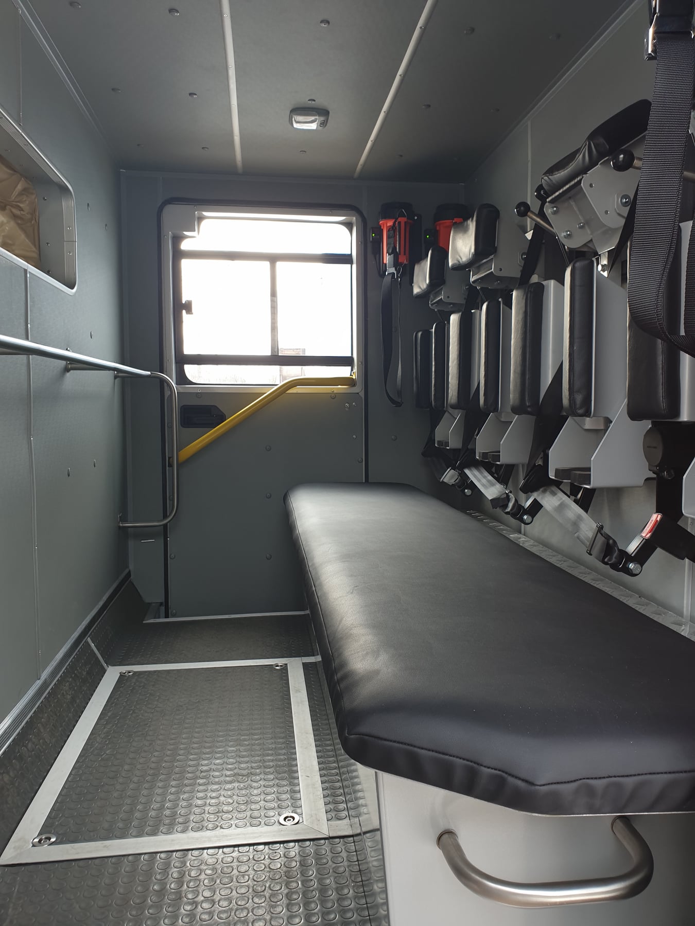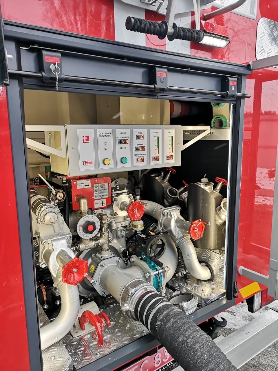 В спецнадстройке смонтированы две полипропиленовые цистерны: одна на 3000 л – для воды, другая на 300 л – для пенообразователя. В кормовом отсеке находится насос производительностью 30 л сек. Привлекают внимание роллеты, окрашенный в черный цвет.