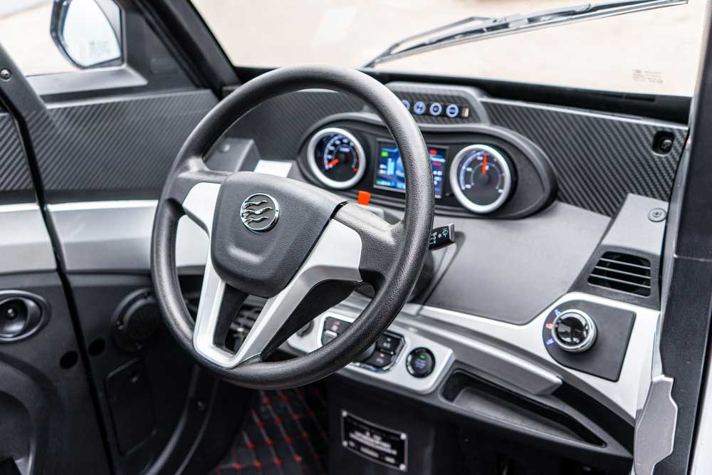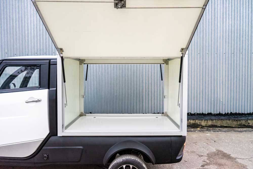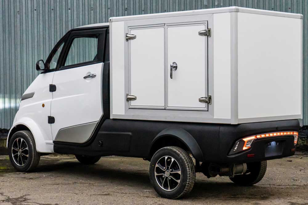 Это компактная машина – длиной 3600 мм, шириной 1345 мм и высотой 1765 мм – может перевозить до 500 кг. Автомобиль укомплектован 4-килловатным электромотором, который питает литиевый аккумулятор на 100 Ач. Максимальная скорость достигает 50 км/ч, а время зарядки батарей составляет около двух часов. По заказу возможна установка дополнительной АКБ.