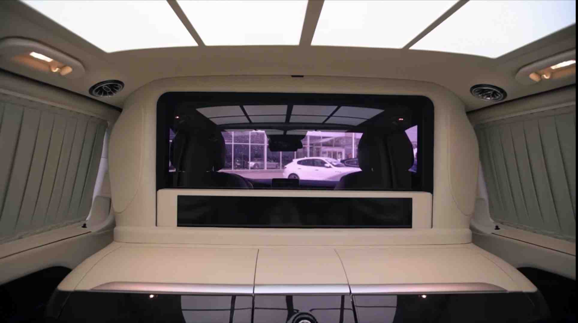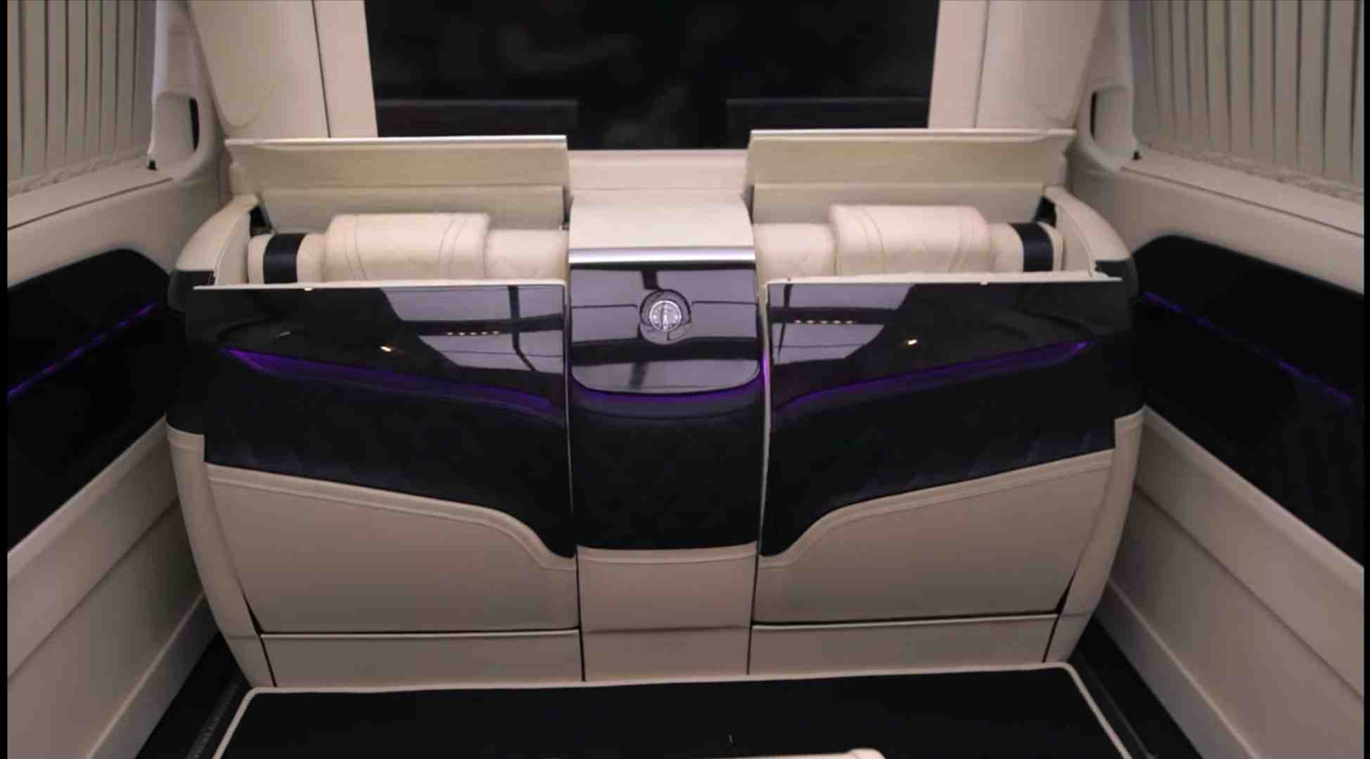 Между креслами имеется консоль управления, с помощью которой можно задействовать электропривод боковых сдвижных дверей, поднять или опустить перегородку с огромным телевизором между салоном и кабиной водителя, убрать сиденья-трансформеры, а также настроить климат-контроль.