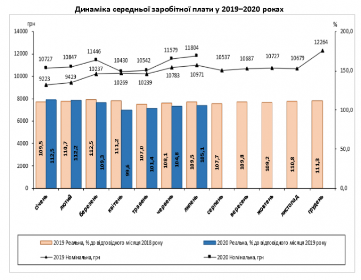 Средняя номинальная заработная плата штатного работника предприятий, учреждений и организаций Украины в июле 2020 года составила 11 804 грн. Это на 2,0% больше по сравнению с июнем – 11 579 грн.