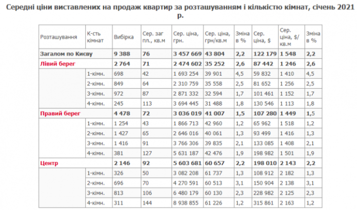 по сравнению с декабрем, средняя цена квартир низкого ценового сегмента увеличилась на 1,4% до 25 442 грн./кв. м, высокого – на 2,4% до 69 873 грн./кв. м. В долларовом эквиваленте цены на квартиры увеличились в «дешевом» сегменте на 1,4% – до 899 долл. США/кв. м, в «дорогом» сегменте на 2,4% – до 2469 долл./кв. м.