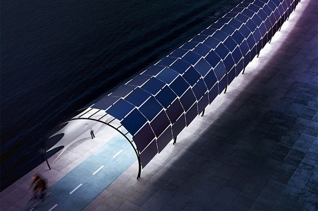 Эта «солнечная крыша» выполняет двойную функцию: защищает велосипедистов и пешеходов от солнца, а также других неблагоприятных погодных условий и производит электроэнергию благодаря солнцу.