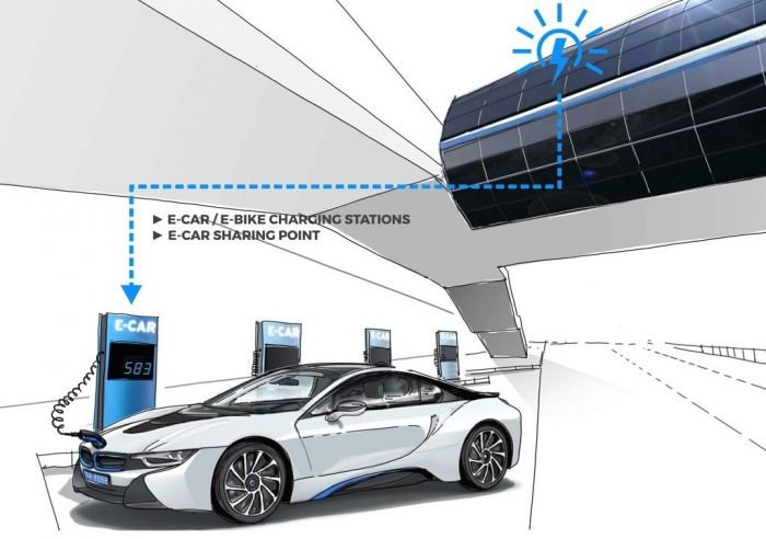 Проект, предварительно созданный для Швейцарии и Дубая, также предусматривает установление зарядных станций для велосипедов или смартфонов.