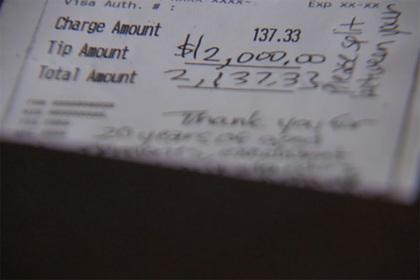 Официант и бармен Эдди Круз (Eddie Cruz) закрыл счет двух посетителей заведения и обнаружил, что супруги оставили для персонала 2 тысячи долларов (146,7 тысячи рублей). Кроме того, они написали на чеке небольшое послание: «Спасибо за 20 лет приятных воспоминаний, великолепной еды и изумительного сервиса. Процветания вам».