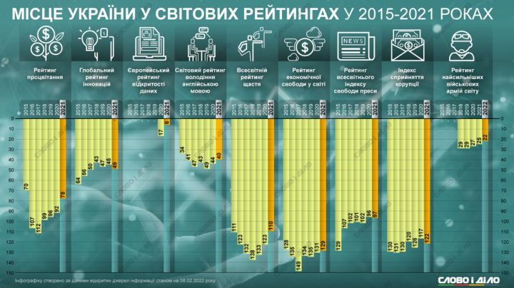 В 2015 году Украина занимала в рейтинге 11 место, в 2016-м – 123, в 2017-м – 132, в 2018-м – 128, в 2019-м – 133, в 2020-м – 123.