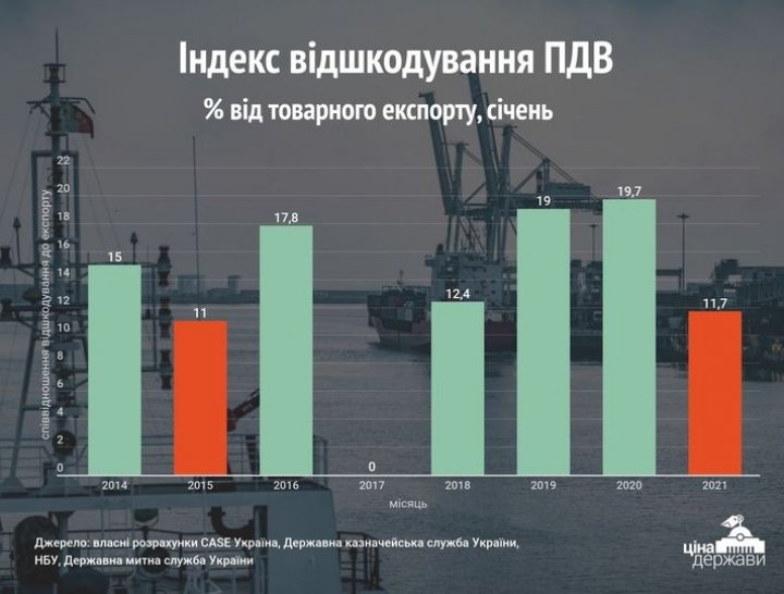 «Тем не менее, январь можно считать „непоказательным“ месяцем. Например, в январе 2017-го года возмещение НДС экспортерам было почти нулевое (0,03 млрд грн к 7,9 млрд грн год назад). Но впоследствии ситуация исправилась. Хотя последние два года, 2019-й и 2020-й год, именно в январе наблюдался всплеск возмещения НДС», — добавили эксперты.