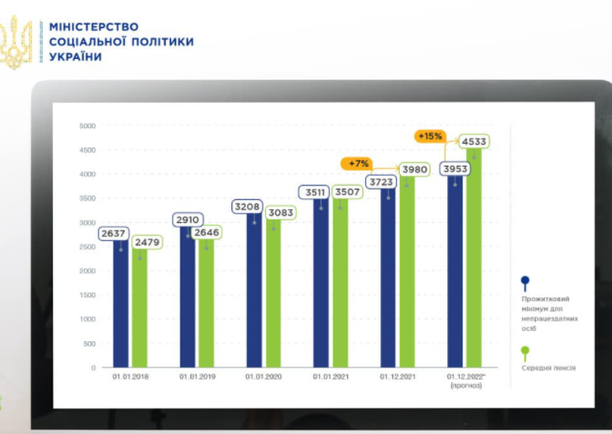 По состоянию на декабрь 2021 размер фактического прожиточного минимума для нетрудоспособных лиц составлял 3723 гривны, а средняя пенсия составляла 3980 гривен.