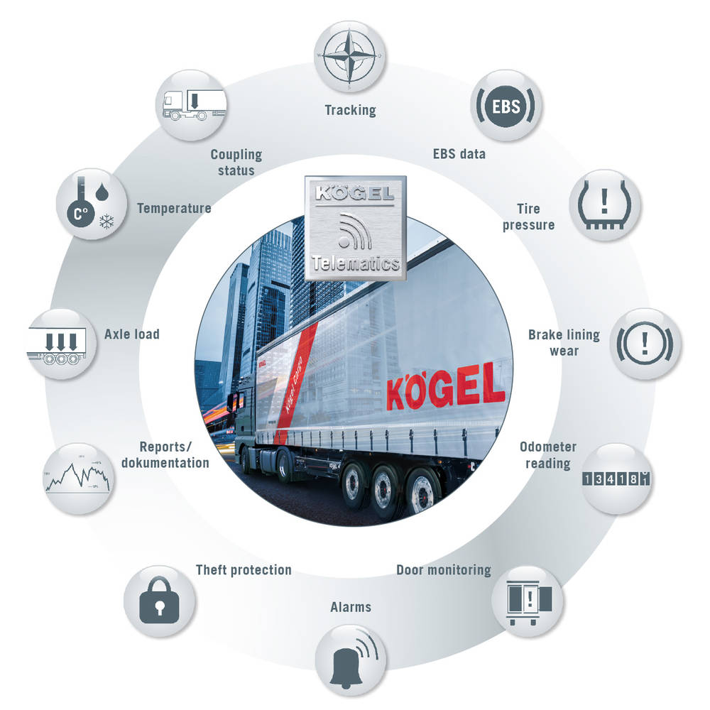 Kögel Telematics – телематическая система обеспечивает доступ в режиме реального времени к данным системы EBS, отслеживанию транспортного средства, холодильному оборудованию, показателям давления в шинах и др. Более того, база данных Kögel Telematics Connectivity позволяет не только отображать все полученные сведения на веб-портале и других системах управления парком, но и импортировать их в реальном времени в существующие процессы и множество программных систем.