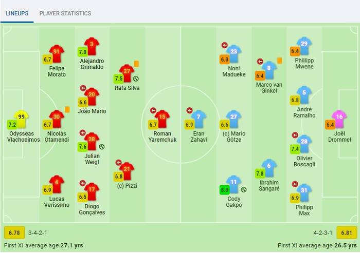 Лучшим игроком встречи стал футболист ПСВ Коди Гакпо (8 баллов), а лучшим в португальском клубе признали Юлиана Вайгля (7,6).