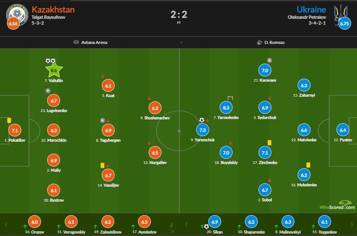 Примечательно, лучшим футболистом встречи стал представитель Казахстана Руслан Валиуллин — 8,6.