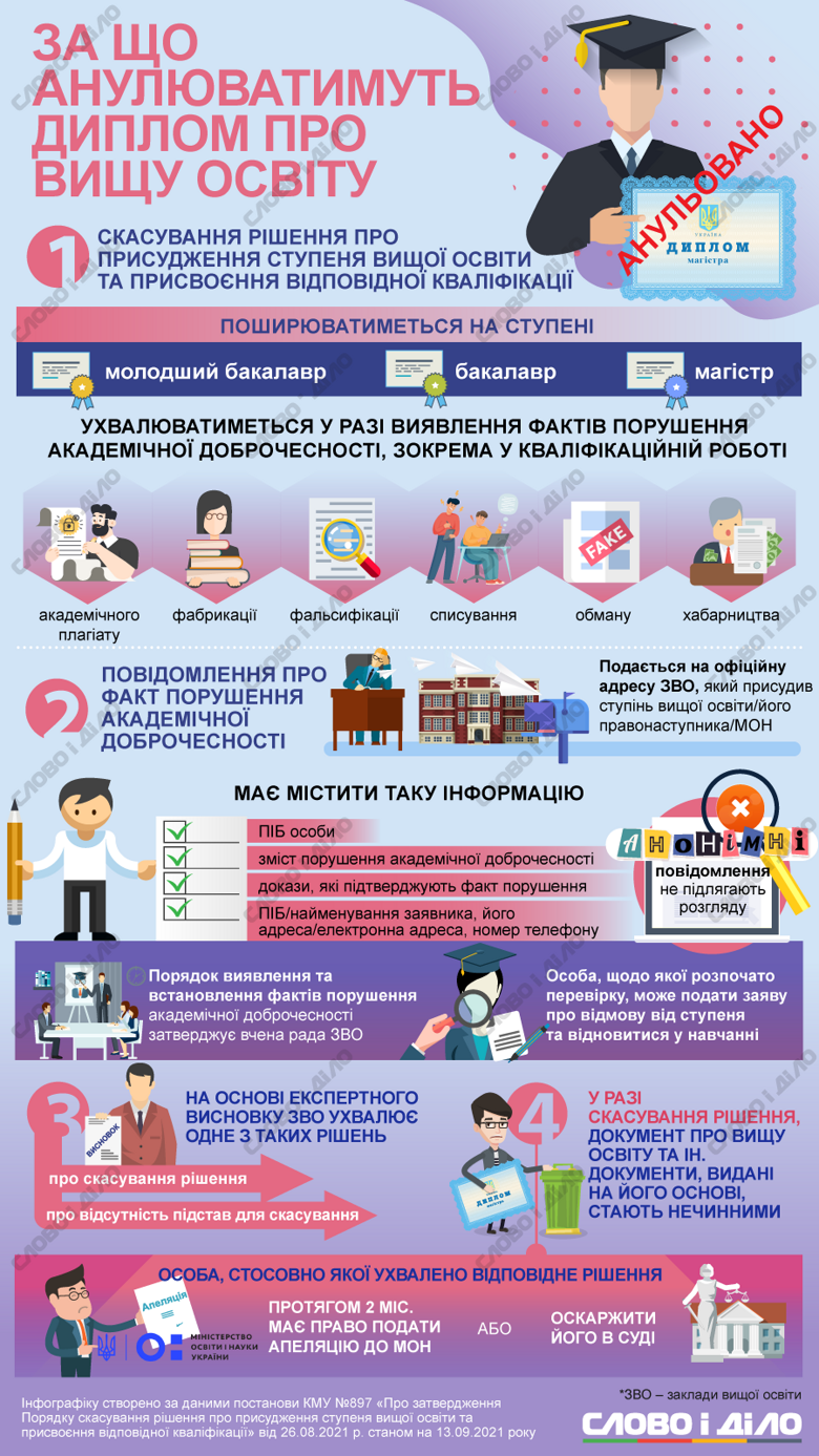 Кабинет Министров принял решение, которое позволяет аннулировать диплом бакалавров и магистров из-за нарушения академической добропорядочности. Нарушение должен фиксировать ученый совет каждого учреждения высшего образования. Человек, которого обвиняют в нарушении, может сам отказаться от диплома и пройти повторную аттестацию.