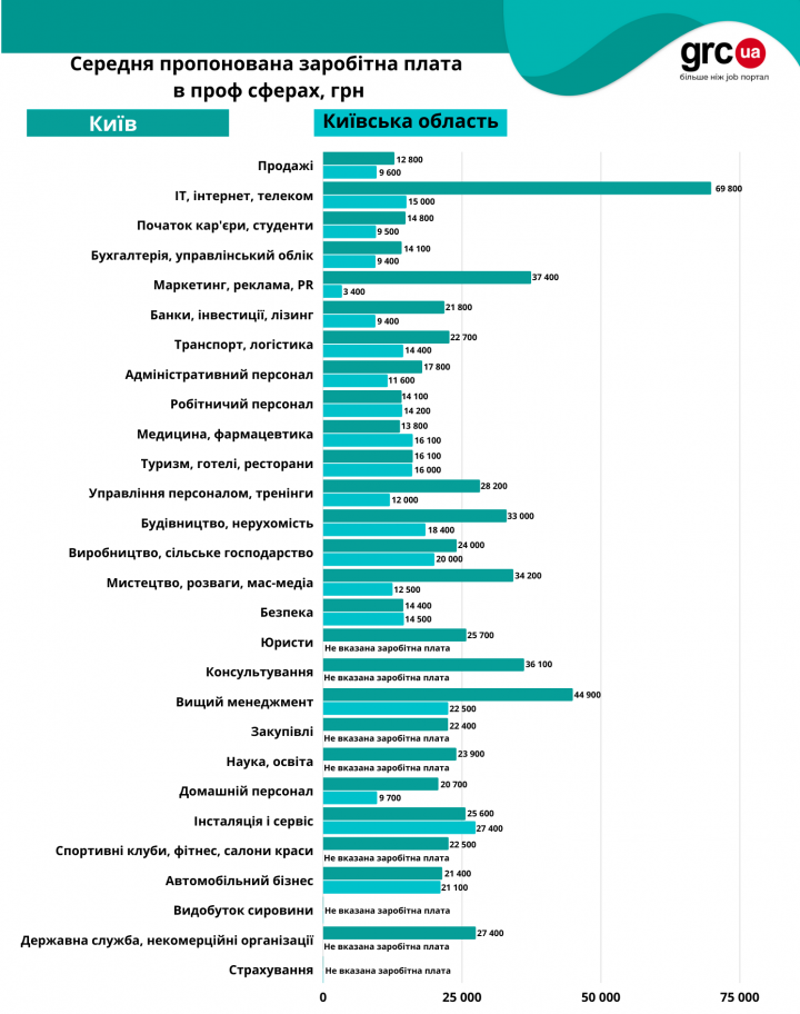 Как отмечают эксперты, специалисты области были менее активны, чем столичные специалисты. Это иллюстрирует показатель конкуренции – в Киеве на 1 рабочее место претендует в среднем 2 специалиста, а в области конкуренция ниже. Это и не удивительно – в столице предлагают вдвое больше зарплату, чем в области: в начале 2022 года средняя заработная плата в открытых вакансиях в Киеве составляет 26 300 грн, а в Киевской области – 11 500 грн.