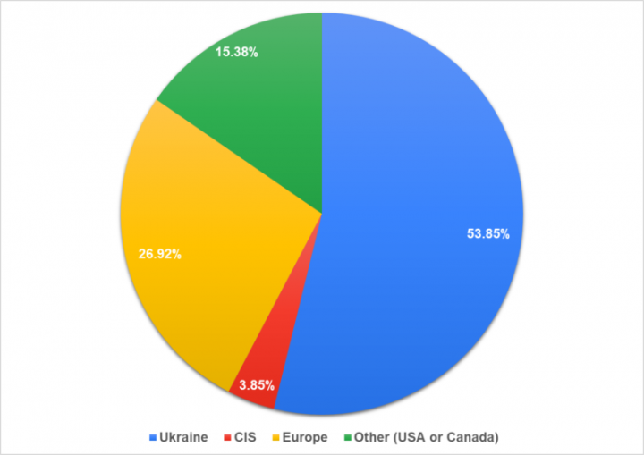 Большинство участников опроса (53,85%) работают в компаниях, основанных в Украине, 26,92% — в европейских.