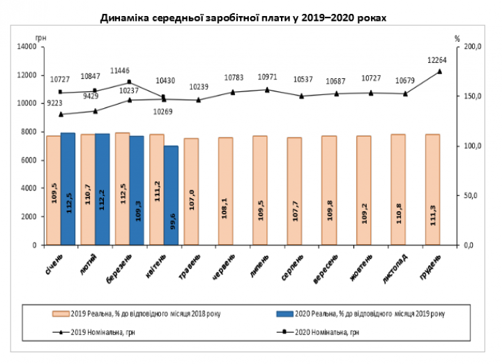 Средняя номинальная заработная плата штатного сотрудника предприятий, учреждений и организаций в апреле 2020 года составляла 10430 грн, что на 8,9% меньше, чем в марте (11446 грн).