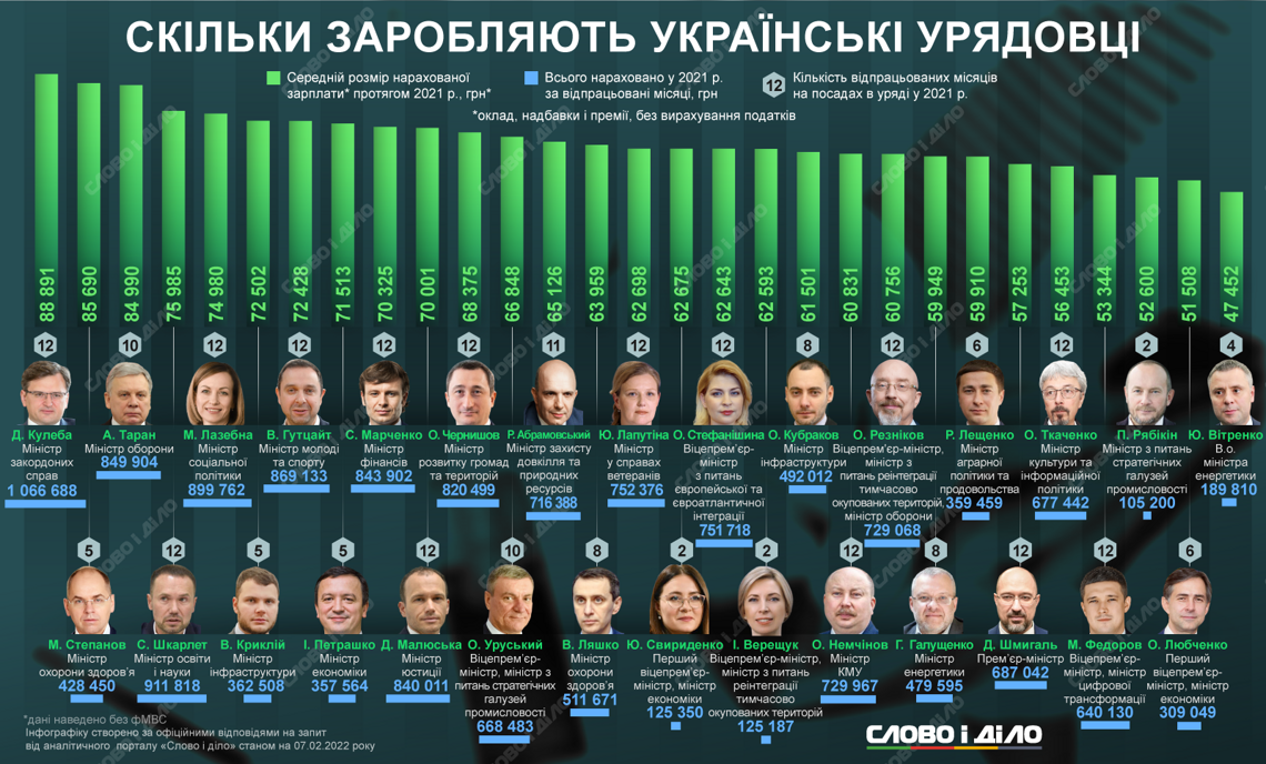 Среди министров больше всего в прошлом году заработал Дмитрий Кулеба – 1 млн 66 тыс. 688 грн. В среднем министр иностранных дел получал около 88,9 тыс. в месяц.