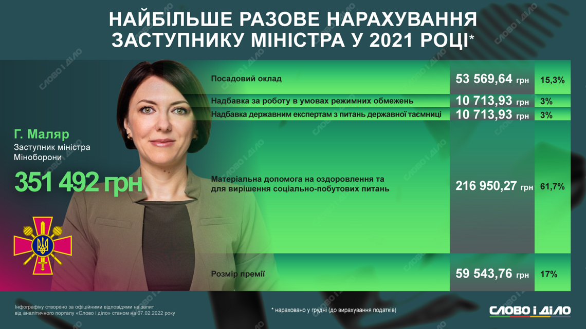 В течение всего года рекордно большую зарплату начислили в декабре Анне Маляр из Министерства обороны – 351,5 тыс. грн. Это оклад, надбавки, помощь на оздоровление и для решения социально-бытовых вопросов, премия. Отметим, что в том месяце еще два заместителя министра обороны заработали более 300 тысяч.