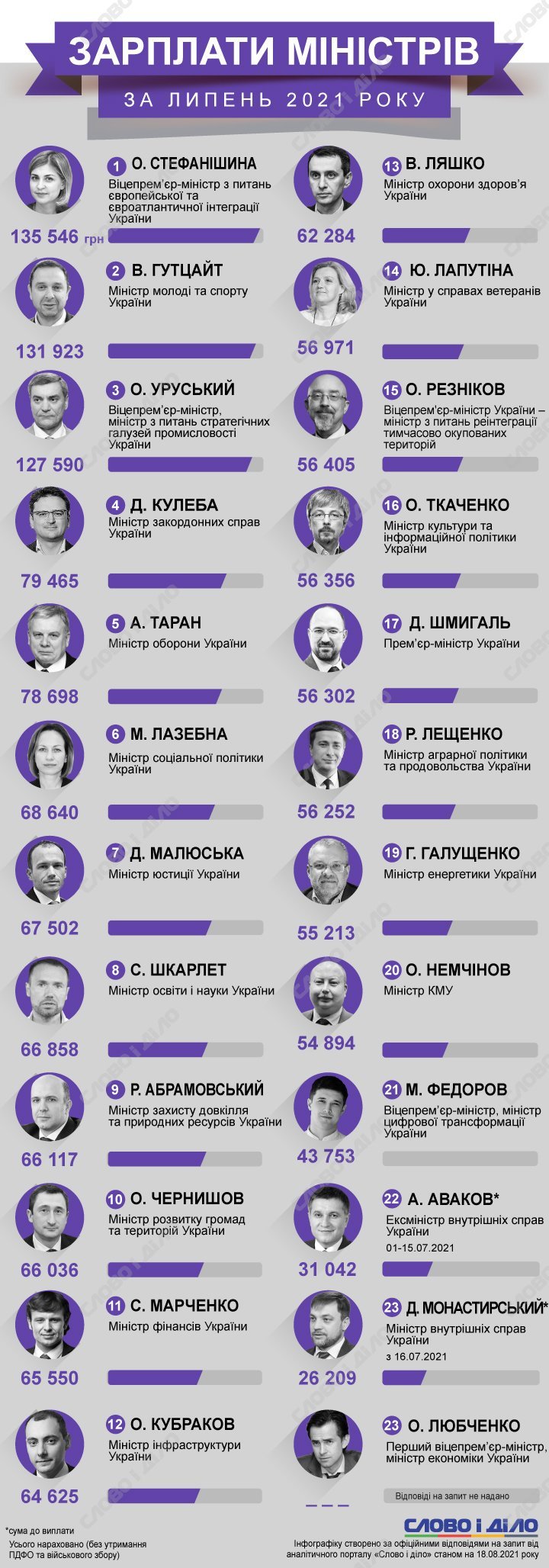 Зарплата премьер-министра Дениса Шмыгаля в июле составила 56 тыс. 302 грн. Последняя зарплата Арсена Авакова как министра внутренних дел – 31 тыс. 42 грн. Нынешний глава МВД Денис Монастырский заработал в июле 26 тыс. 209 грн – меньше других министров (но его назначили только 16 июля).