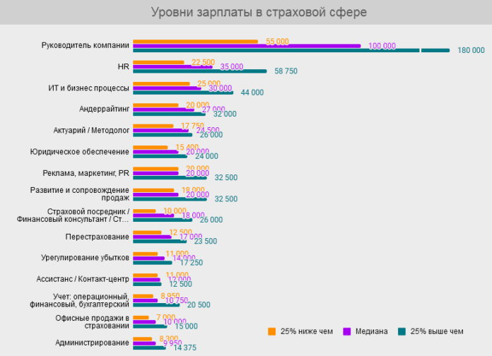 Уровень зарплаты руководителя компании от 55 тыс. грн до 180 тыс. грн. А офисные продажи в страховании от 7 тыс. до 15 тыс. грн. ІТ и безнес-процессы — от 35 тыс. грн до 44 тыс. грн