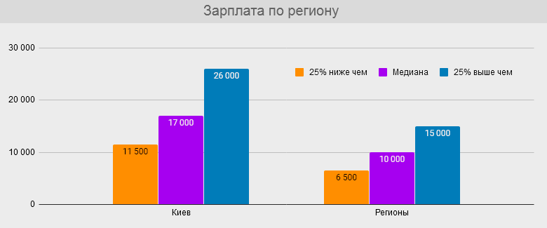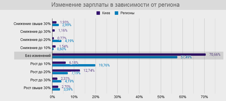 Регионы. По регионам без изменений зарплаты -о 57,5%. В столице — 70,7%, рост выше 20% наблюдался у 17,7% работников в Киеве и + 10% в регионах у 20% опрошенных.