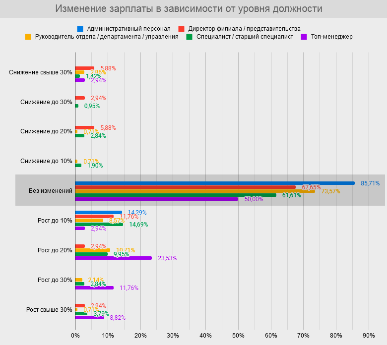 Изменение зарплат в зависимости от уровня должностей – меньше всего изменений произошло у административного персонала 87% работников, руководителей подразделений — 74% и директоров филиалов 68%.