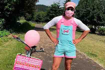«Вы когда-нибудь хотели расквитаться с вашим мужем? — обратилась она к читателям. — Что ж, я уличила своего мужа в измене, но вместо развода мы заключили сделку. Раз в неделю он должен выходить на улицу в нелепейших нарядах, какие мне только придут в голову». В один из таких дней жена надела на неверного мужа розово-белый лонгслив, детский комбинезон с розовым бантом и такого же цвета берет, медицинскую маску и очки.