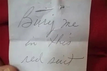 Согласно материалу, Джоанн (JoAnn) купила пиджак красного цвета в неназванном благотворительном магазине. По приезде домой женщина обнаружила в кармане приколотый на булавку белый клочок бумаги. Американка достала записку и увидела, что на ней было написано: «Похороните меня в этом наряде».