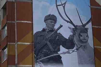 В Усинске, республика Коми, повесили баннер к 9 Мая, на котором был изображен не советский, а финский солдат. Фото плаката распространилось в соцсетях 3 мая. На нем изображен солдат с оленем. В руках он держит финский автомат Suomi KP/31. На их фоне написан фрагмент стихотворения «Рогатые батальоны» Галины Грицаченко.